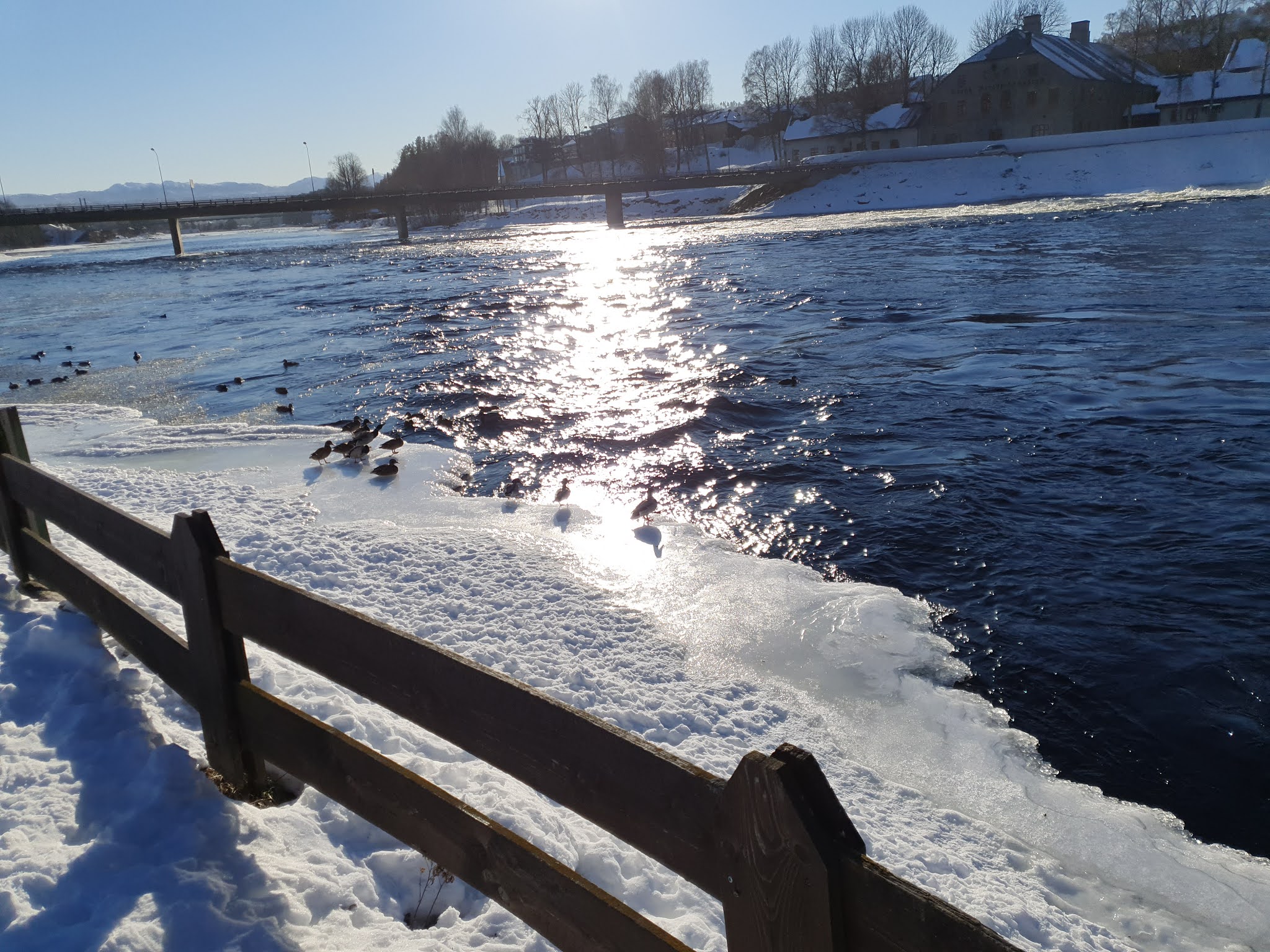 Tusen takk. Langs denne elven som er Norges tredje største finnes det alltid åpent vann. Det er så mye kraft/strømninger i den at vannet fryser aldri helt til. Det var fryktelig kaldt den dagen, men nå er det bare -4. Så det hjelper veldig. Nå skal vi få snø i noen dager og så skal det bli hele 7 grader. Vi får se hva det blir til.