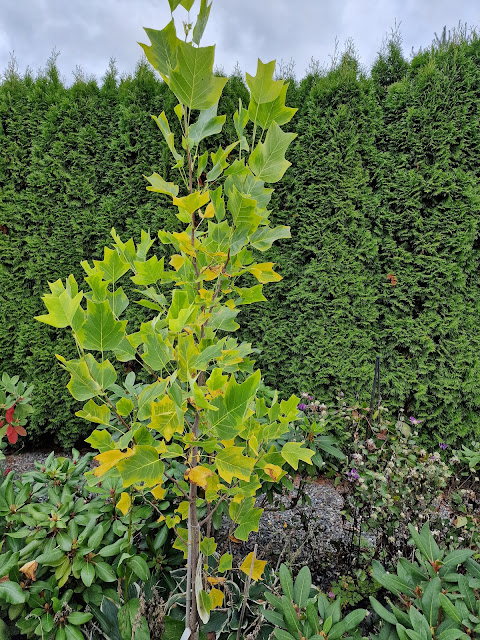 Dette bilder er fra september i fjor høst. Tulipantre/ Liriodendron tulifera 'Aureomarginata' heter det. Det ble også bespist av rådyr i vinter, men ikke så mye. Kanskje det ikke smakte så godt...