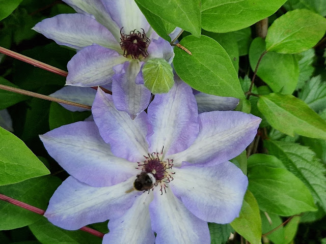 Jeg har så mange clematis, og her blomstrer fire av de samtidig.